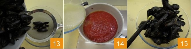 Coe os mexilhões recolhendo o caldo em uma tigela 13, para despejá-lo mais facilmente no molho 14. Deixe cozinhar por mais 10 minutos; enquanto isso, retire o alho 15 e a salsa dos mexilhões e reserve-os.