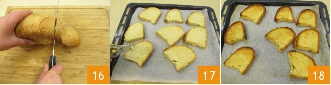 Falta apenas o acompanhamento crocante: corte o pão pugliese 16, coloque-o em uma assadeira coberta com papel manteiga e despeje um fio de azeite 17, depois torre por alguns minutos no forno sob a grelha a 250º por 3 minutos, até que fique bem dourado 18.