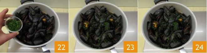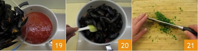 Uma vez que o molho estiver pronto, adicione os mexilhões 19 e misture 20. Depois pique finamente a salsa 21