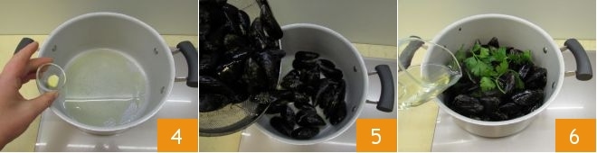 Coloque em uma panela metade da quantidade indicada de óleo e adicione um dente de alho descascado e inteiro 4; deixe dourar e acrescente os mexilhões 5. Adicione um ramo de salsa inteiro e o vinho branco para flambar 6,