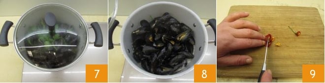 depois tampe 7 e deixe os mexilhões abrirem 8: isso levará cerca de 4 minutos, assim que se abrirem, você poderá desligar o fogo. Enquanto isso, retire as sementes da pimenta e pique-a finamente 9.