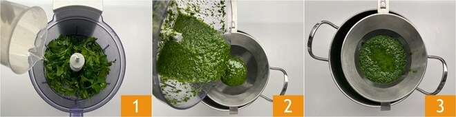 Para preparar o creme de topinambur com vieiras grelhadas, primeiro dedique-se ao óleo verde: coloque a salsa em um liquidificador, depois adicione o óleo de sementes 1 e bata por 5 minutos. Coe o creme obtido usando uma peneira fina 2 e posicione uma tigela embaixo para recolher o líquido. Coloque a peneira e a tigela na geladeira e deixe coar por 4 horas 3.