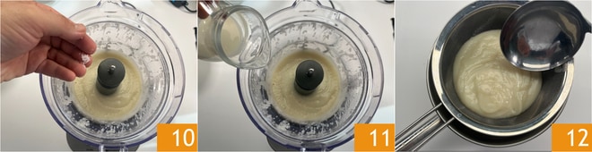 Agora transfira a polpa de topinambur para o liquidificador e bata em alta velocidade por 3 minutos. Ajuste o sal 10, adicione o leite de amêndoas 11 e bata novamente por pelo menos 5 minutos, até obter um creme liso. Passe o creme por uma peneira 12.