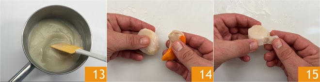 Coloque o creme de topinambur em uma panela pequena 13 para aquecê-lo pouco antes de servir. Por fim, prepare as vieiras: remova o coral 14 e a parte mais dura 15, depois coloque-as sobre papel toalha para secar.
