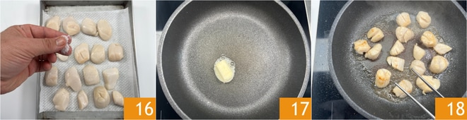 Salgue as vieiras de ambos os lados 16. Em uma panela antiaderente, derreta a manteiga 17, depois coloque as vieiras e grelhe por 2 minutos de cada lado 18.