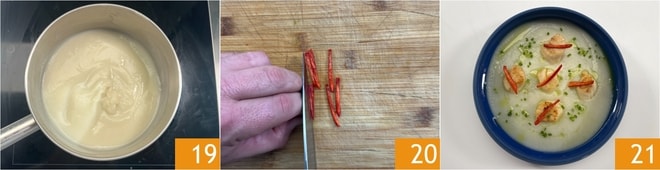 Aqueça o creme de topinambur 19. Enquanto isso, corte os pimentões ao meio no sentido longitudinal e remova as sementes, depois fatie-os em julienne 20. Você está pronto para servir: distribua no fundo um pouco de creme de topinambur, depois adicione 5 vieiras por prato e decore com cebolinha picada finamente e o pimentão. Complete com algumas gotas de óleo de salsa e seu creme de topinambur com vieiras grelhadas está pronto para ser servido 21!