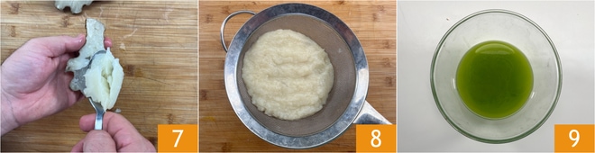 Retire a polpa com uma colher 7 e coloque-a em uma peneira para eliminar o excesso de água 8. Enquanto isso, retire o óleo verde da geladeira e deixe-o voltar à temperatura ambiente 9.