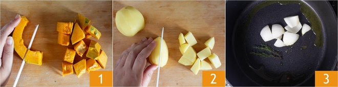Para preparar a sopa cremosa de abóbora e batatas, primeiro prepare o Caldo de legumes e mantenha-o aquecido. Limpe a abóbora e corte grosseiramente a polpa em cubos 1, depois faça o mesmo com as batatas 2 e a cebola. Aqueça um fio de azeite em uma panela com os raminhos de tomilho, depois adicione a cebola e refogue por alguns minutos 3.