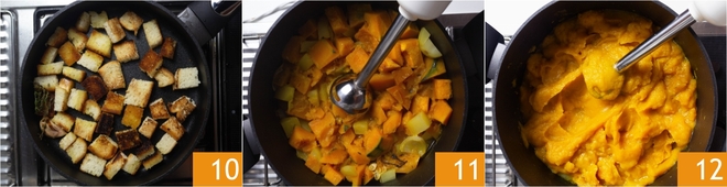 Toste os croutons, virando-os frequentemente, até que fiquem crocantes e dourados 10. Neste ponto, bata a abóbora e as batatas na panela com um mixer de imersão 11 até obter uma consistência lisa e homogênea 12; se necessário, você pode diluir o creme com um pouco de caldo.
