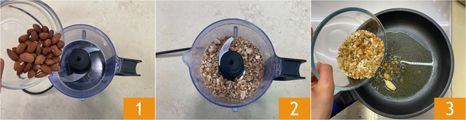 Para preparar o creme de abobrinha e batatas, primeiro coloque as amêndoas no processador 1, depois triture rapidamente para picá-las grosseiramente 2. Em uma frigideira, adicione o óleo, o alho e deixe refogar por alguns minutos. Adicione a farinha de rosca 3 e toste em fogo médio até dourar.