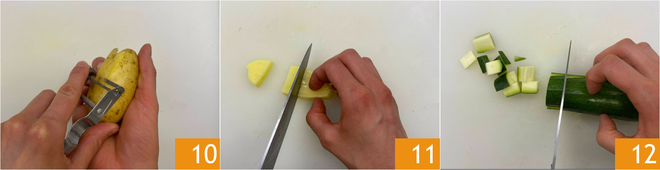 Descasque as batatas 10 e corte-as em fatias e depois em cubos de aproximadamente 1 cm 11. Corte as extremidades das abobrinhas e corte-as em fatias e depois em cubos 12.