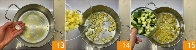Em uma panela, adicione o óleo e o alho 13, aqueça por alguns minutos, depois adicione as batatas 14 e doure por 10 minutos. Neste ponto, adicione as abobrinhas 15.