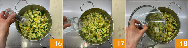 Refogue por mais 5 minutos, depois retire o alho e ajuste o sal e a pimenta 16. Adicione a água 17, abaixe o fogo, cubra com a tampa 18 e cozinhe por cerca de 15 minutos ou até que os vegetais estejam macios.