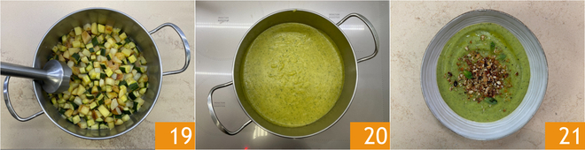 Bata tudo com um mixer de imersão 19 para obter uma consistência cremosa 20. Sirva e decore com a farinha de rosca e as amêndoas. O creme de abobrinha e batata está pronto para ser saboreado 21!