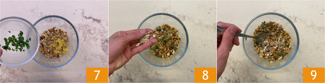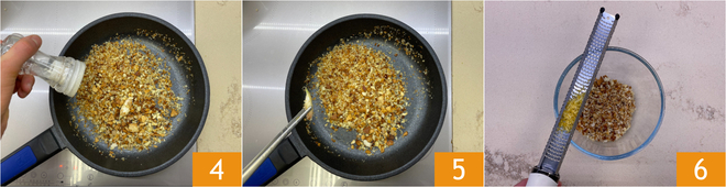 Ajuste o sal 4, retire o alho 5 e transfira tudo para uma tigela, depois deixe esfriar. Aromatize a farinha de rosca com a casca de limão 6.