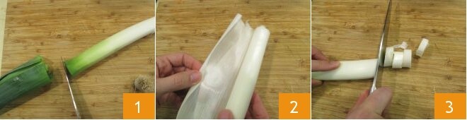 Para preparar o creme de aipo-rábano, primeiro limpe os vegetais: lave os alhos-porós em água corrente, elimine a parte verde 1 e a parte com a raiz que está na extremidade oposta, depois faça um corte longitudinal com a faca e remova as folhas externas mais duras 2; finalmente, corte o caule do alho-poró em pedaços de cerca de 2 cm de espessura 3. Você deve obter cerca de 280 g de alho-poró limpo.