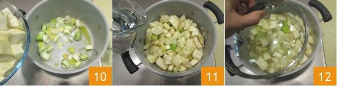 e de aipo-rábano 10, aumente o fogo e toste-os por mais 5 minutos, depois adicione a água fria 11, cubra com uma tampa 12 e deixe cozinhar em fogo médio por cerca de 40 minutos.