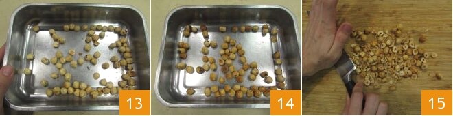 Enquanto isso, coloque as avelãs descascadas em uma assadeira 13 e toste-as em forno ventilado pré-aquecido a 190° por cerca de 15 minutos ou até que fiquem douradas 14; uma vez torradas, quebre grosseiramente as avelãs esmagando-as com a parte plana da lâmina de uma faca 15.