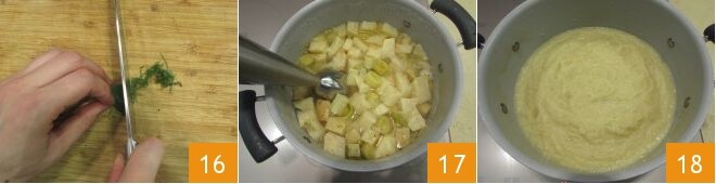 Finalmente, pique finamente as folhas de sálvia que você tinha reservado 16. Após o tempo de cozimento dos vegetais, desligue o fogo e bata tudo com um mixer de mão 17 até obter uma mistura cremosa 18.