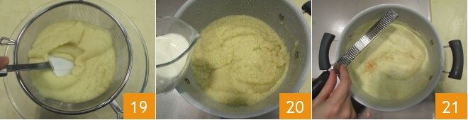 Despeje o creme em uma peneira e coe com a ajuda de uma espátula, para obter uma consistência sedosa 19. Adicione o creme de leite fresco 20 e a noz-moscada ralada 21 e mexa bem.