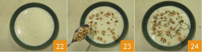 Agora você pode transferir o creme para um prato fundo 22, decore a superfície com as avelãs torradas 23, adicione um pouco de sálvia picada e uma pitada de pimenta: seu delicioso creme de aipo-rábano está pronto para ser saboreado 24!