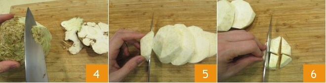 Agora passe para o aipo-rábano: lave-o cuidadosamente em água corrente para remover os resíduos de terra, depois retire a casca com a lâmina afiada de uma faca 4 e corte-o primeiro em fatias 5 e depois em pedaços de cerca de 2 cm de espessura 6. Você deve obter cerca de 1,2 kg de aipo-rábano limpo.