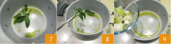 Aqueça o óleo em uma panela, adicione as folhas de sálvia (guarde algumas folhas para a decoração final) e deixe que aromatizem o óleo por cerca de 5 minutos em fogo médio-baixo 7, em seguida, remova-as com uma pinça de cozinha 8. Neste ponto, adicione os pedaços de alho-poró 9