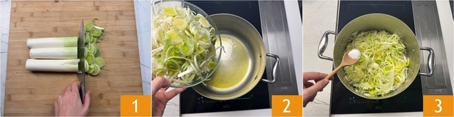 Para preparar o creme de alho-poró, comece limpando os alhos-poró e cortando os corações em fatias finas 1; reserve a parte verde que você usará para servir. Coloque o alho-poró em uma panela com um fio de azeite 2 e adicione um pouco de sal para ajudar a liberar os líquidos 3. Mexa de vez em quando e deixe cozinhar.