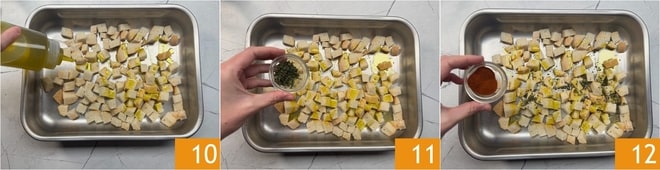 Coloque os cubos de pão em uma assadeira, depois tempere com azeite 10, alecrim e sálvia picados 11 e páprica doce 12.