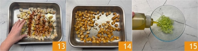 Misture bem com as mãos para temperar uniformemente 13 e asse os croutons no forno a 200°C em modo estático por 10 minutos 14. Enquanto isso, tempere a parte verde do alho-poró que você reservou com azeite e sal 15 e mexa.