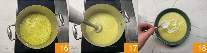 Neste ponto, as batatas e os alhos-poró estarão cozidos 16, bata-os com um mixer de imersão por pelo menos um minuto para obter uma consistência sedosa, adicionando um pouco de água se necessário 17. Por último, ajuste o sal. Sirva decorando a superfície com um fio de iogurte 18.