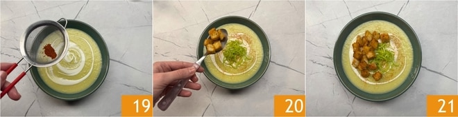 Complete os pratos com uma pitada de páprica 19, os alhos-poró verdes, um fio de azeite e os cubinhos de pão 20. O seu creme de alho-poró com croutons saborosos está pronto para ser servido 21!