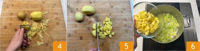 Enquanto isso, dedique-se às batatas: descasque-as 4 e corte-as em cubos de 1,5 cm 5, depois adicione-as ao alho-poró na panela 6.