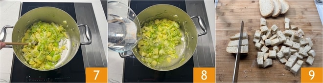 Misture bem e deixe pegar sabor por alguns minutos 7, depois cubra com água 8 e deixe cozinhar em fogo médio-baixo por cerca de 25 minutos. Enquanto isso, corte o pão em cubos de 1,5 cm 9.