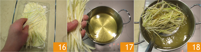 e refogue em fogo médio até que fique levemente dourado e crocante 13, coloque-o sobre um prato com papel absorvente para secar o excesso de gordura 14. Enquanto isso, aqueça o óleo vegetal em uma panela de bordas altas. Escorra o alho-poró cortado da água com gelo, seque-o bem com um pano 15