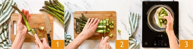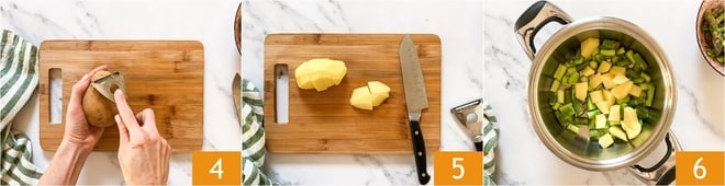Descasque a batata 4 e corte-a em pedaços grandes de cerca de dois centímetros 5. Em uma panela, adicione as rodelas de aspargos (mas não as pontas) e as batatas 6.
