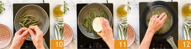 Em uma frigideira antiaderente, coloque um fio de azeite, adicione os aspargos, uma pitada de sal e algumas folhas de manjerona 10. Acrescente 2-3 colheres de sopa de água 11, tampe 12 e cozinhe por 3 minutos. Devem ficar crocantes.