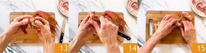 Limpe os camarões removendo a carapaça 13 e o filamento preto 14. Enrole meia fatia de bacon em cada camarão 15 e prepare todos assim.