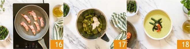Cozinhe os camarões na frigideira 16, virando-os de todos os lados por um total de 3 minutos, até que fiquem crocantes. Depois, coloque em um mixer os aspargos e as batatas, adicione o creme azedo 17 e bata tudo, até obter um creme. Se estiver muito denso, adicione 1-2 colheres de sopa de água morna. Transfira a sopa cremosa para os pratos, decore com as pontas dos aspargos e os camarões 18. Adicione uma pitada de pimenta, um fio de azeite cru e sementes de gergelim.
