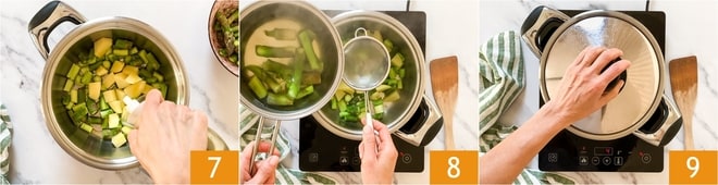 Acrescente um fio de azeite 7, uma pitada de sal e deixe dourar por alguns minutos. Depois, adicione o caldo feito com a base dos aspargos, coando 8. Tampe 9 e deixe cozinhar por 20 minutos em fogo médio.