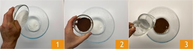 Para preparar a creme de café com água, primeiro despeje em uma tigela bem grande o açúcar 1, o café solúvel 2 e a água 3. Considere que, uma vez montado, o creme será muito volumoso.