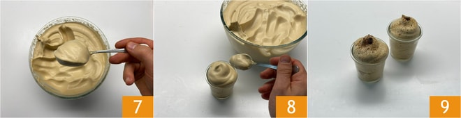 O creme deve ficar muito espumoso, ao retirar uma quantidade com uma colher 7 e virá-la, ela não deve escorregar. Transfira o creme obtido para os copinhos 8, decore com café em pó e com os grãos de café antes de servir 9.