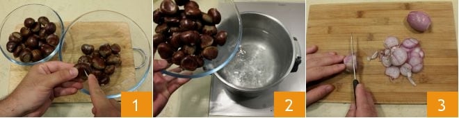 Para preparar a sopa cremosa de castanhas com porcini e guanciale crocante, comece colocando no fogo uma panela com água para preparar o Caldo de legumes. Em seguida, proceda com a limpeza das castanhas: faça um corte nas castanhas com uma faquinha 1 e depois cozinhe-as em uma panela de pressão com bastante água por 12 minutos 2 (alternativamente, use uma panela normal e cozinhe por cerca de 30 minutos). Pegue a cebola échalote, retire a casca e corte em rodelas 3.