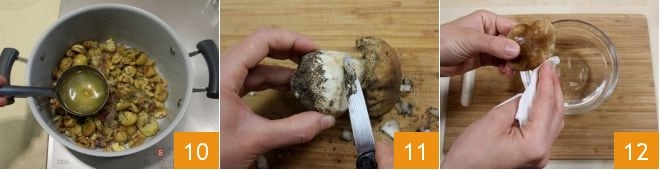 Deixe dourar por 2 minutos e depois despeje o caldo de legumes que você preparou cobrindo bem as castanhas 10: reserve uma parte e adicione caso o caldo seque. Cozinhe em fogo alto por 15-20 minutos e, enquanto isso, cuide da limpeza dos Como limpar os cogumelos porcini: com uma faquinha de lâmina lisa retire a parte terrosa do caule, raspando com delicadeza até eliminar qualquer traço de terra 11. Se os cogumelos estiverem bastante limpos, retire os poucos resíduos de terra com um pincel ou com um pano de algodão 12, se ainda estiverem muito sujos, passe-os rapidamente sob um jato de água corrente fria.