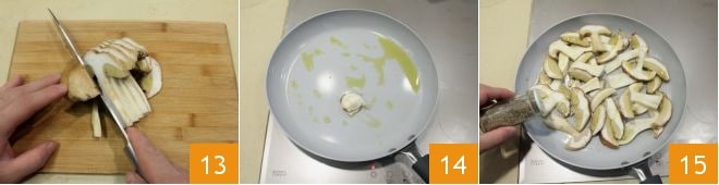 Terminada a limpeza, corte os cogumelos inteiros no sentido do comprimento 13. Refogue um dente de alho com casca em uma frigideira antiaderente com o azeite 14, depois doure os cogumelos por 10 minutos, ajustando sal e pimenta 15.