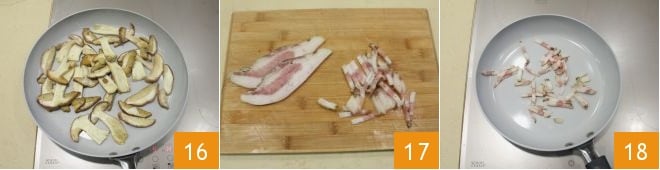 Quando os cogumelos estiverem prontos, desligue e reserve 16. Corte o guanciale em fatias e depois em tiras 17, então cozinhe por alguns minutos no fogo para eliminar a gordura e deixá-lo crocante 18.