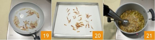 Quando o guanciale estiver bem dourado 19, coloque-o em uma assadeira forrada com papel manteiga para liberar a gordura criada no cozimento 20. Passado o tempo necessário, as castanhas estarão bem amolecidas: desligue o fogo e bata-as com um mixer de imersão 21