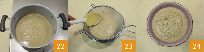 até obter um creme denso 22. Neste ponto, passe a sopa cremosa por uma peneira fina até obter um creme liso e homogêneo 23; transfira para um prato de servir, decorando com os cogumelos e o guanciale crocante que você preparou. Sua saborosa sopa cremosa de castanhas com porcini e guanciale crocante está pronta: desfrute imediatamente 24!