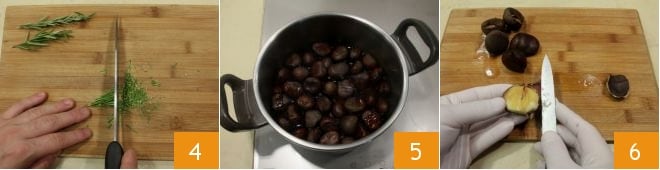 Pique finamente o alecrim 4 e reserve. Quando as castanhas estiverem prontas 5, use luvas de látex e com uma faquinha descasque-as ainda quentes, retirando-as uma a uma de seu líquido de cozimento conforme as limpa 6.