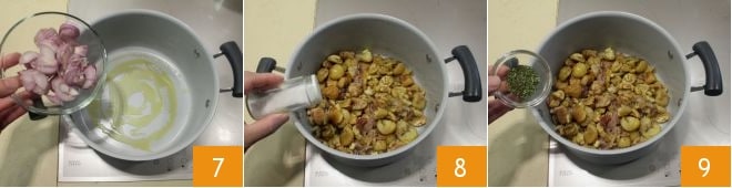 Após este procedimento, refogue a échalote em fogo médio em uma frigideira antiaderente com o azeite, mexendo bem com uma espátula 7. Coloque as castanhas previamente limpas no fogo, adicionando sal e pimenta a gosto 8 junto com o alecrim picado 9.